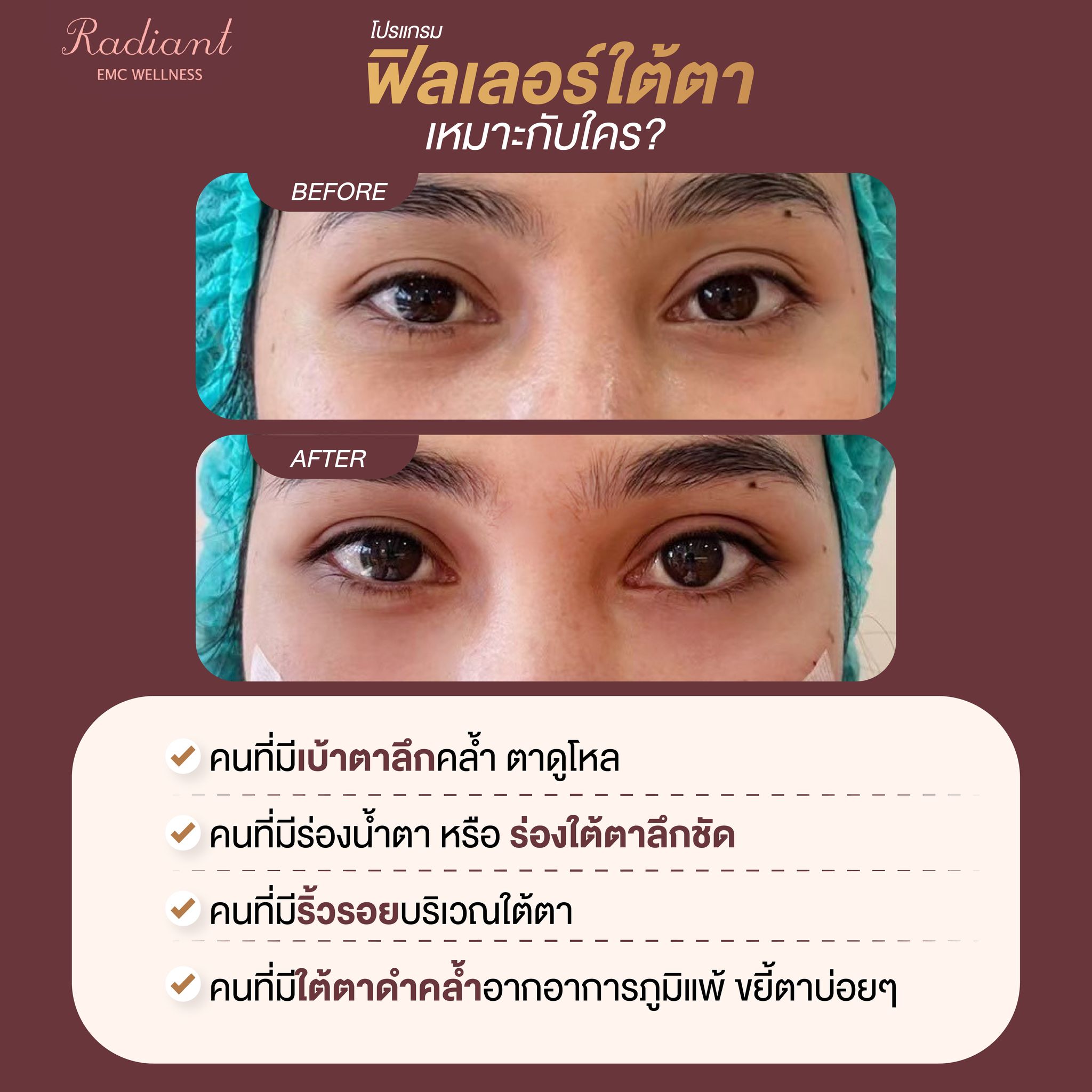 โปรแกรมฟิลเลอร์จะช่วยเติมเต็มผิวบริเวณใต้ตาให้เรียบเนียนขึ้นและให้ผลลัพธ์ที่ดูเป็นธรรมชาติ